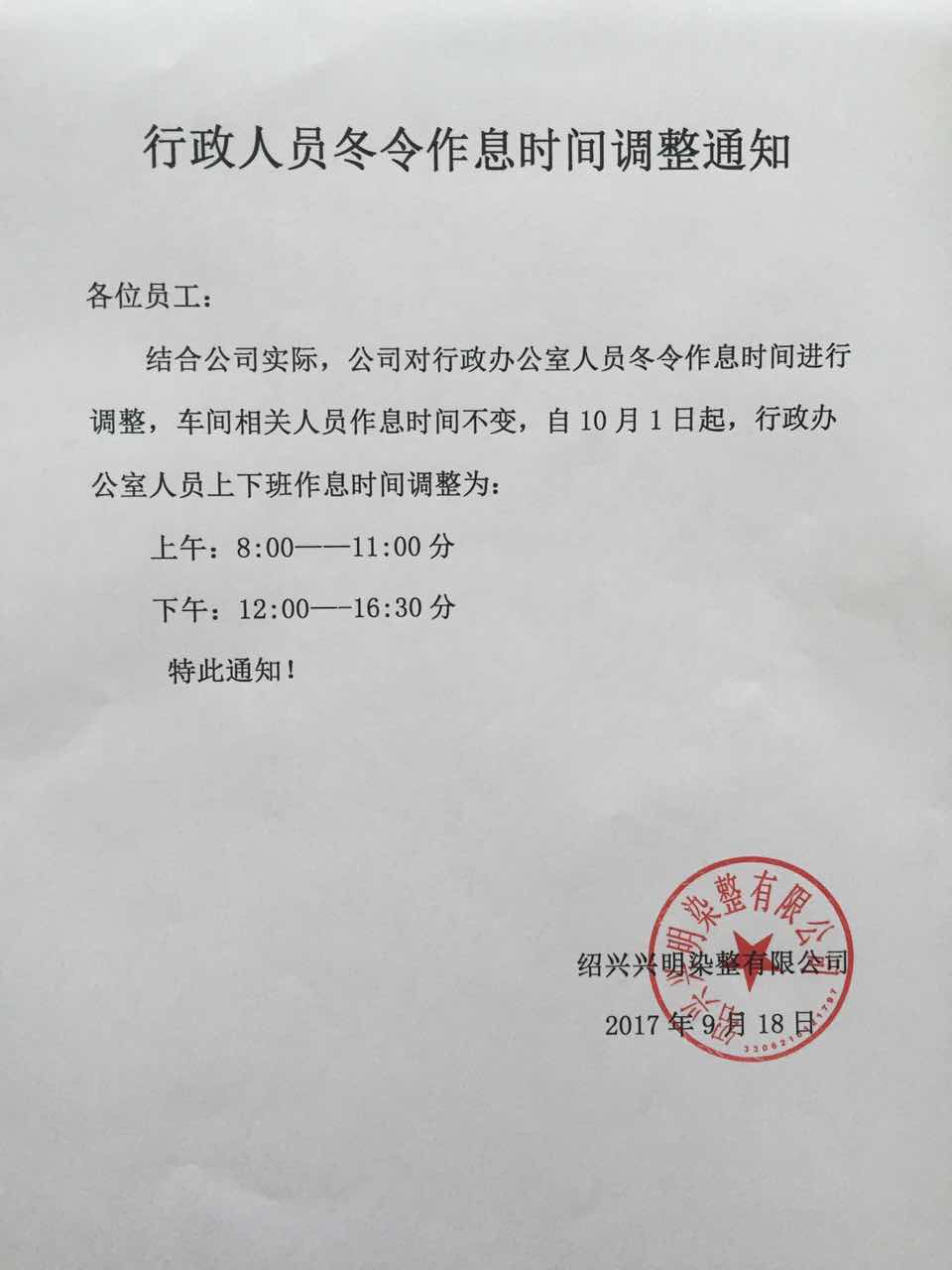 結(jié)合公司實(shí)際,公司對(duì)行政辦公室人員冬令作息時(shí)間進(jìn)行調(diào)整,車間相關(guān)人員作息時(shí)間不變,自10月1日起,行政辦公室人員上下班作息時(shí)間調(diào)整為: