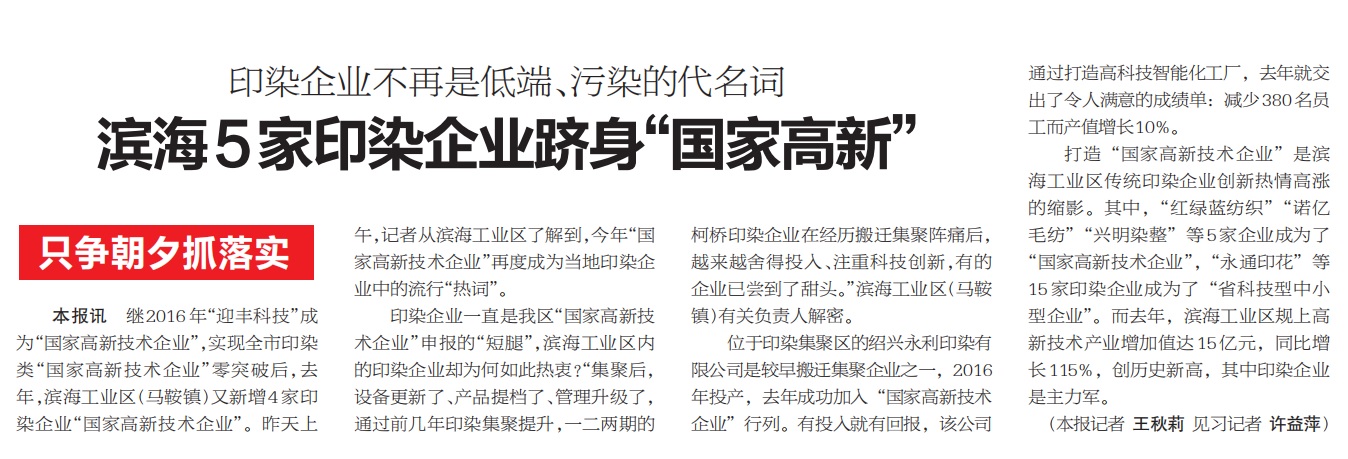 本報訊 2016迎豐科技成為國家高新技術企業(yè),實現(xiàn)全市印染類國家高新技術企業(yè)零突破后,去年,濱海工業(yè)區(qū)(馬鞍鎮(zhèn))又新增4家印染企業(yè)國家高新技術企業(yè)。昨天上午,記者從濱海工業(yè)區(qū)了解到,今年國家高新技術企業(yè)再度成為當?shù)赜∪酒髽I(yè)中的流行熱詞。